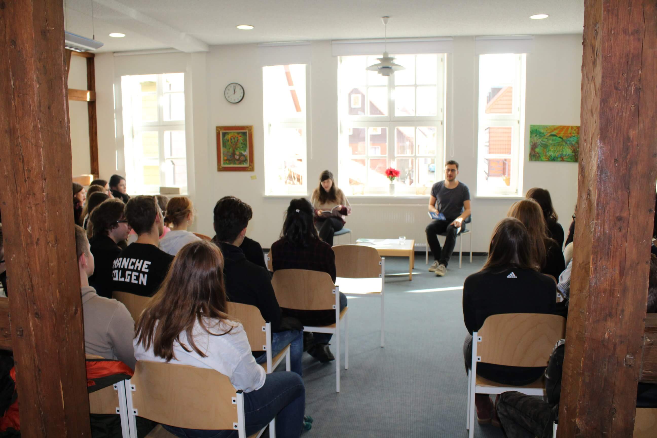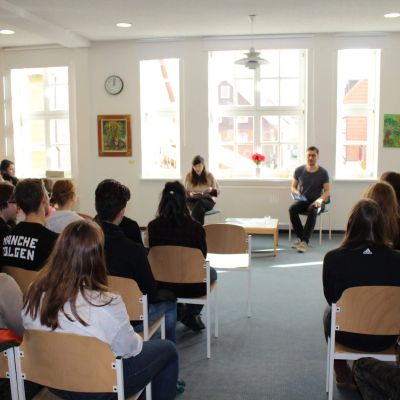 Im Rahmen der beiden gelesenen Abschnitte haben wir unsere Erfahrungen mit dem grenzüberschreitenden Leben in Europa aufgezeigt. Sarah hat ihre sehr eindrucksvollen Erlebnisse aus ihrem zweijährigen Aufenthalt in Frankreich mit den Schülern geteilt – und Daniel ist insbesondere auf seine Zeit in Italien eingegangen. Nach den Erfahrungsaustauschen haben wir Fragen, wie z.B. welche Kulturgemeinschaften für Jugendliche wichtig seien oder eine sich verändernde Bedeutung von Nationalstaaten lebhaft und durchaus auch kontrovers diskutiert. Sarah und Daniel haben jedenfalls sowohl dem Nationalismus als auch dem allgegenwärtig vorzufinden Eurozentrismus eine klare Absage erteilt.
